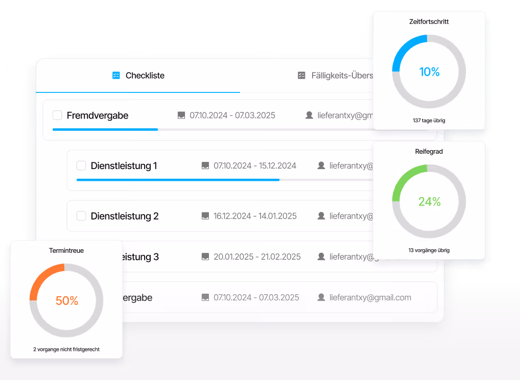 Lieferanten werden strukturiert in Projekte integriert und liefern Fortschritte, Termine und Dateien direkt im System zurück.
